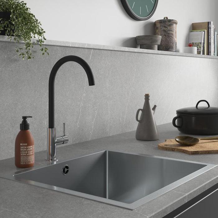 Black is an increasingly on-trend choice for those looking to add an ultra-modern touch, and this combination of bold black and premium chrome is an easy way to enhance a contemporary space. Featuring a smooth single-lever design, this product offers seamless control over both hot and cold water from a single spout. The swan neck style is a timeless look that makes this fitting suitable for contemporary and classically-inspired spaces alike, while its two-tone finish adds an eye-catching feature. This fixture comes with a two-year guarantee for added peace of mind that it is built to last.